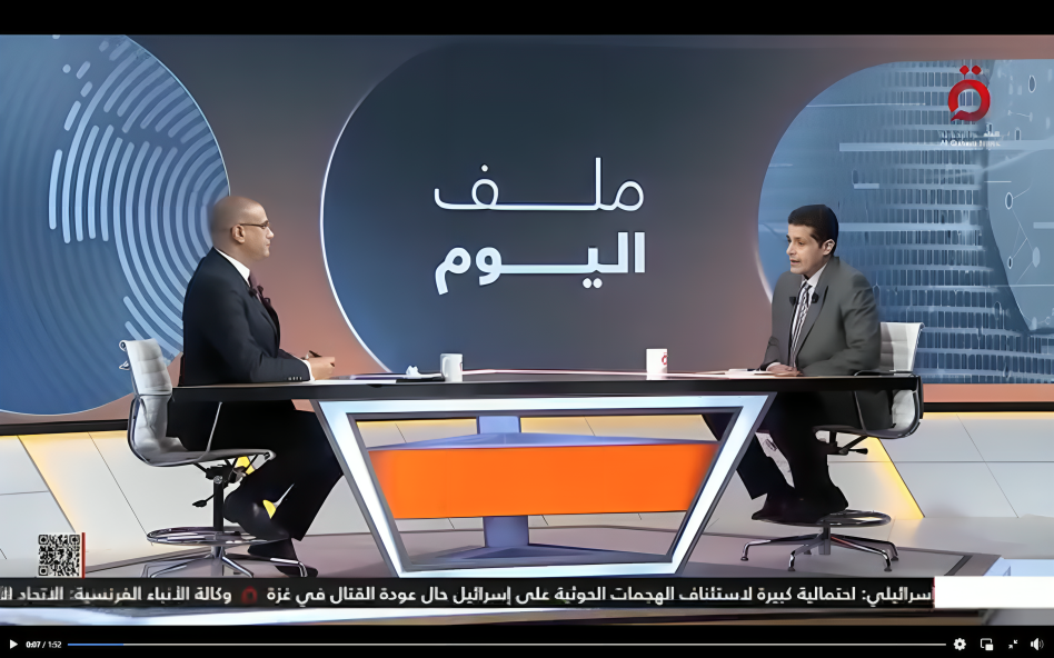 جانب من مشاركتي يوم 19 فبراير 2025 ببرنامج ملف اليوم علي شاشة AlQahera News ، وحديث حول عقبات الانتقال للمرحلة الثانية من تنفيذ اتفاق الهدنة وتبادل الأسري بين المقاومة الفلسطينية والاحتلال الإسرائيلي