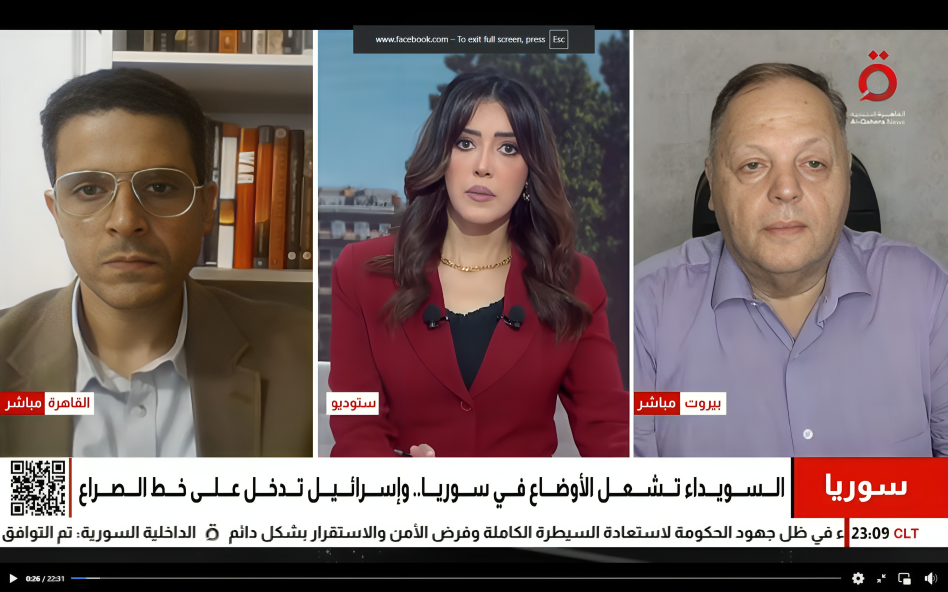 مداخلتي يوم 16 يوليو 2025 علي شاشة القاهرة الإخبارية للتعقيب علي أحداث السويداء، وتصاعد وتيرة الاقتتال الطائفي واضطهاد الاقليات في سوريا من جانب نظام الشرع والتدخل الإسرائيلي السافر الذي بات يغذي النزعات الانفصالية داخل الوطن السوري