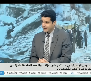 مساء يوم 26 ديسمبر 2024 علي شاشة النيل للأخبار وحديث بشأن الأوضاع بقطاع غزة والضربات الإسرائيلية الأخيرة علي اليمنAdminAugust 8, 2025لقاء مساء يوم 26 ديسمبر 2024 علي شاشة النيل للأخبار وحديث بشأن الأوضاع بقطاع غزة والضربات الإسرائيلية الأخيرة علي اليمن ... أكمل القراءة